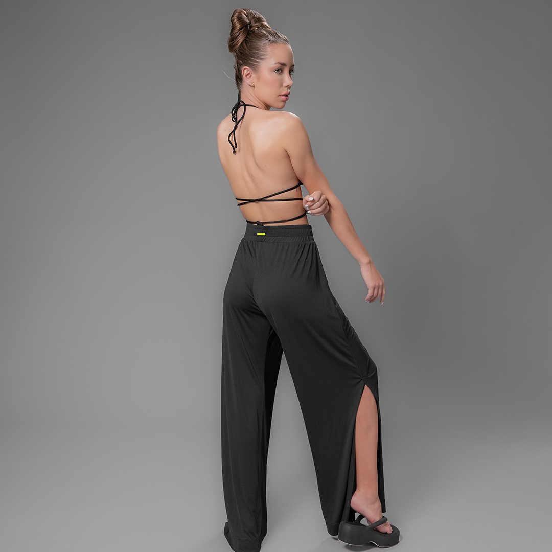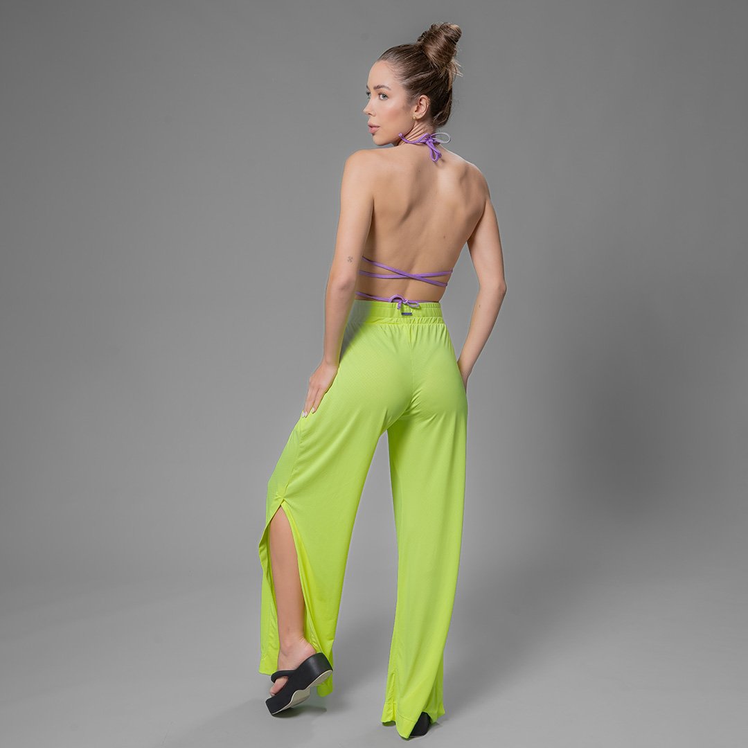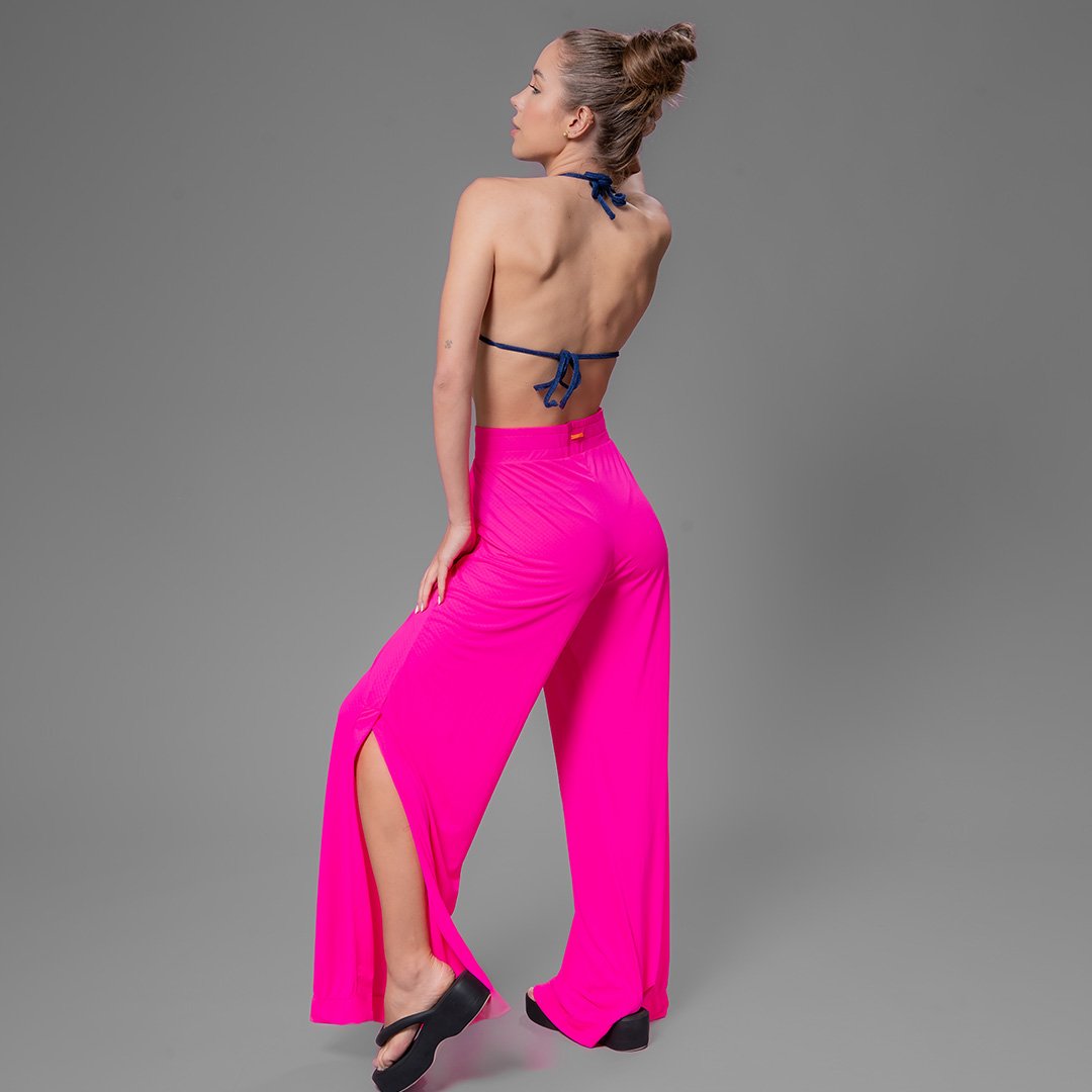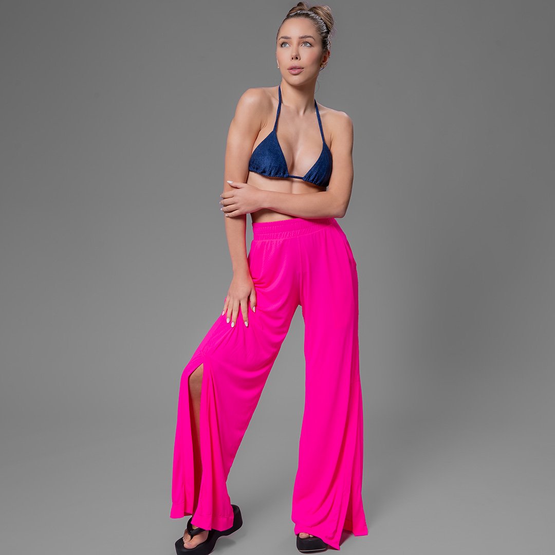 Calça cintura alta em poliamida com fenda lateral, em tecido leve que combina perfeitamente nos dias de verão.