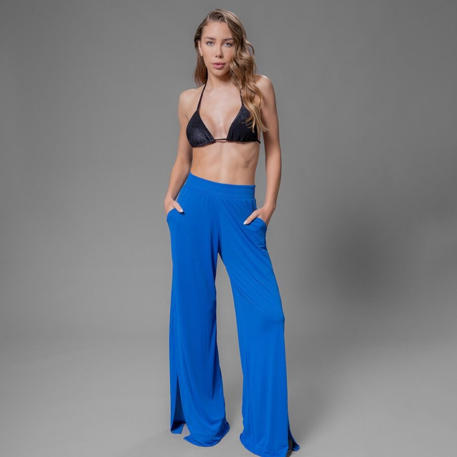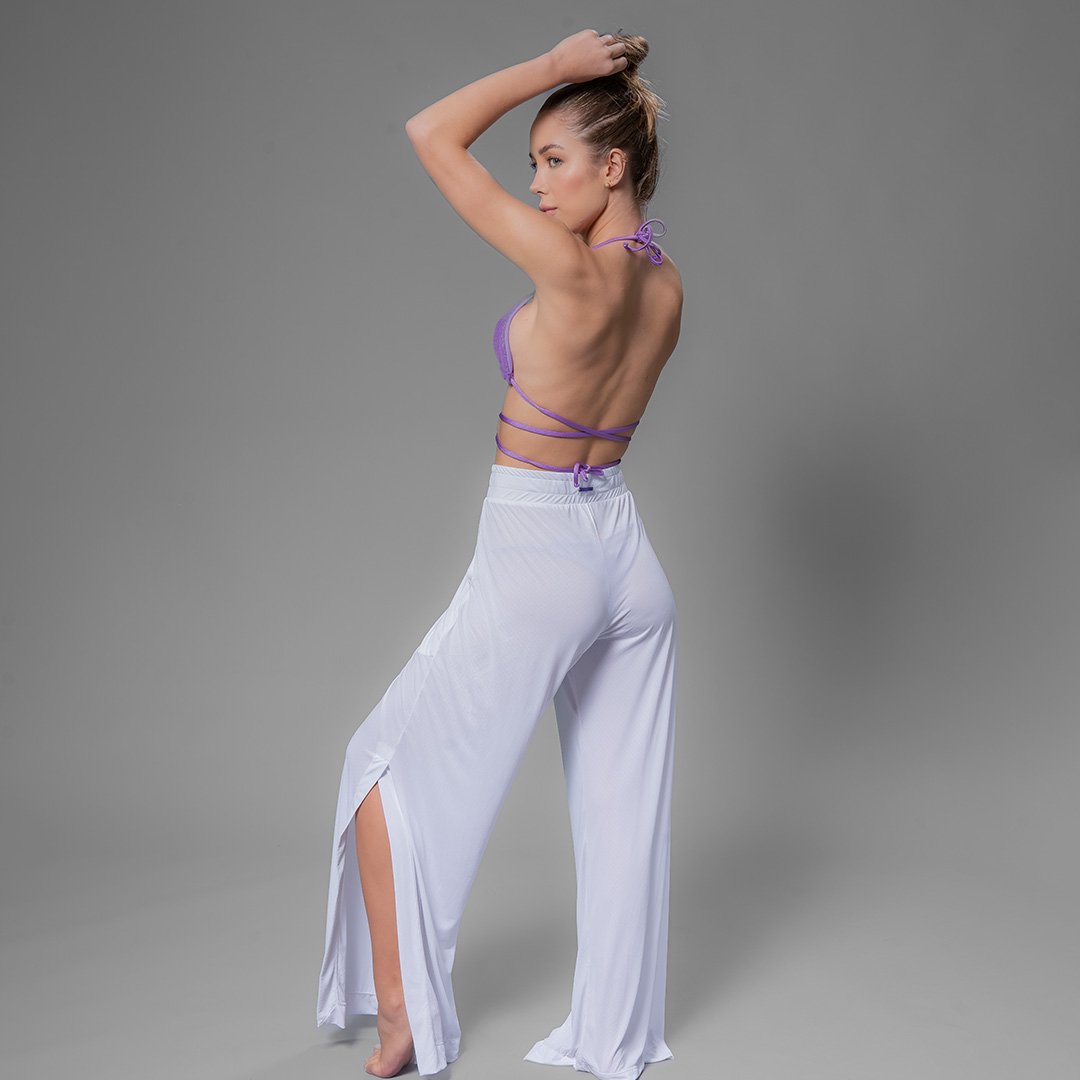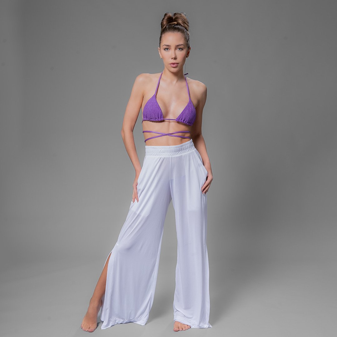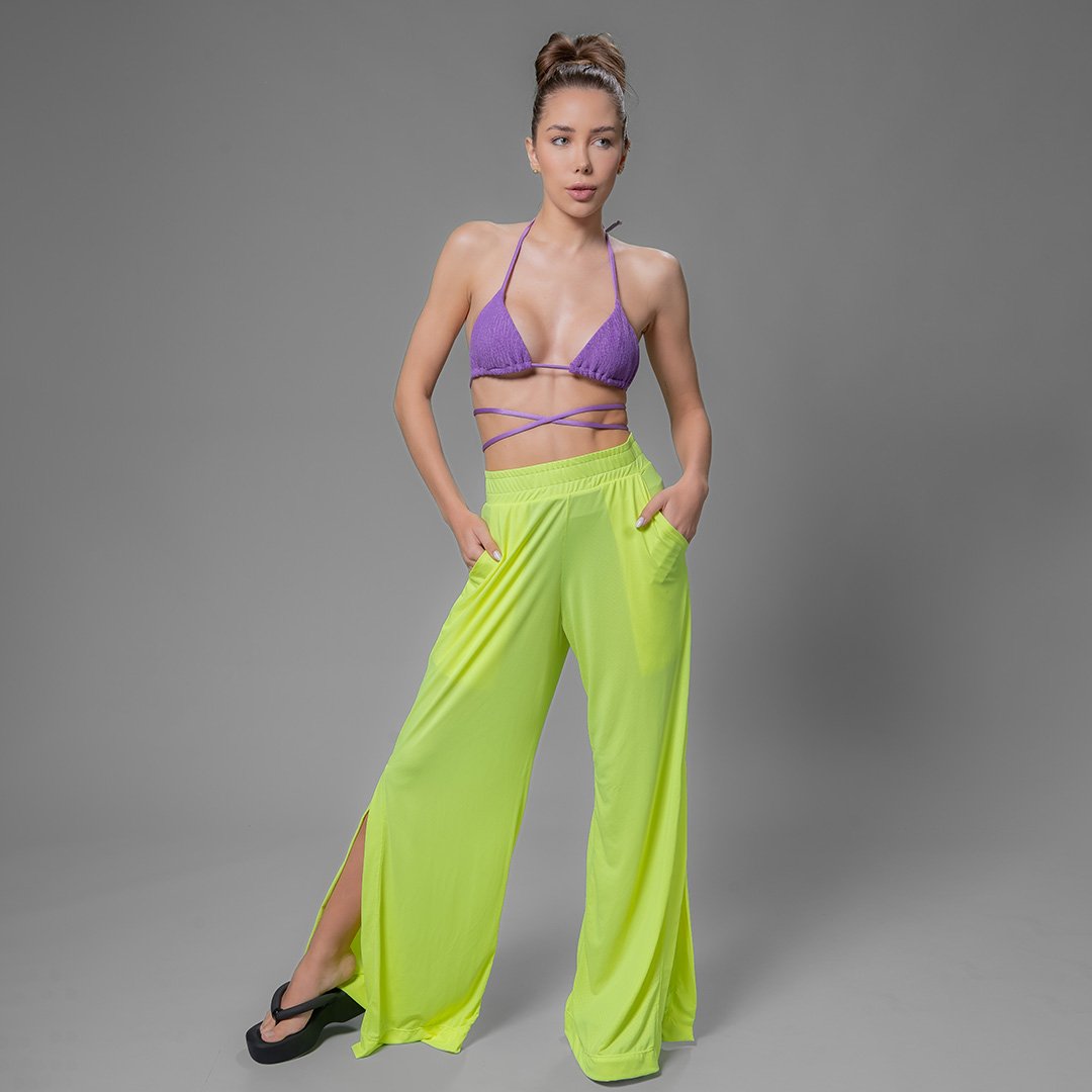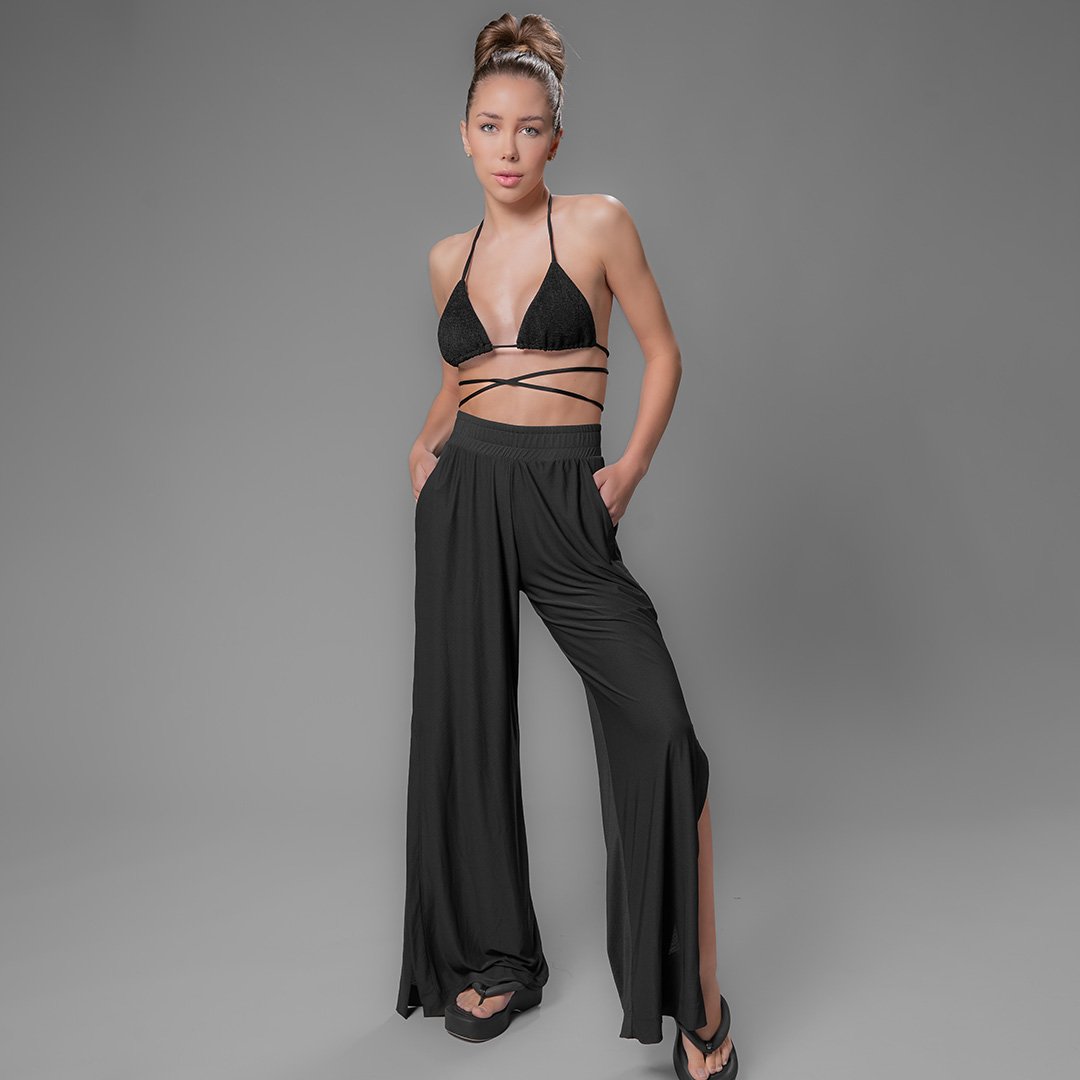 Calça cintura alta em poliamida com fenda lateral, em tecido leve que combina perfeitamente nos dias de verão.