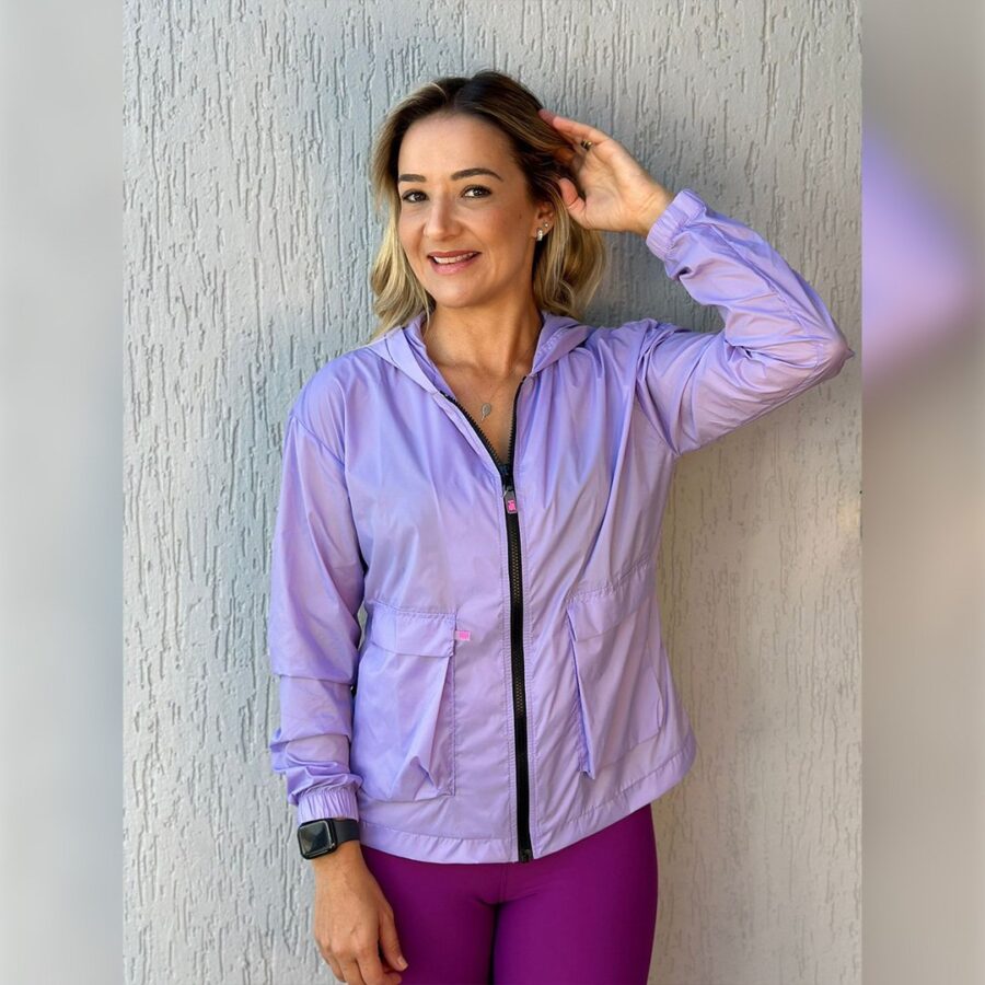 A jaqueta corta vento feminina ametista, possui capuz, bolsos laterais e funcionais, elástico no punho, zíper trator e design que permite movimentos amplos.
