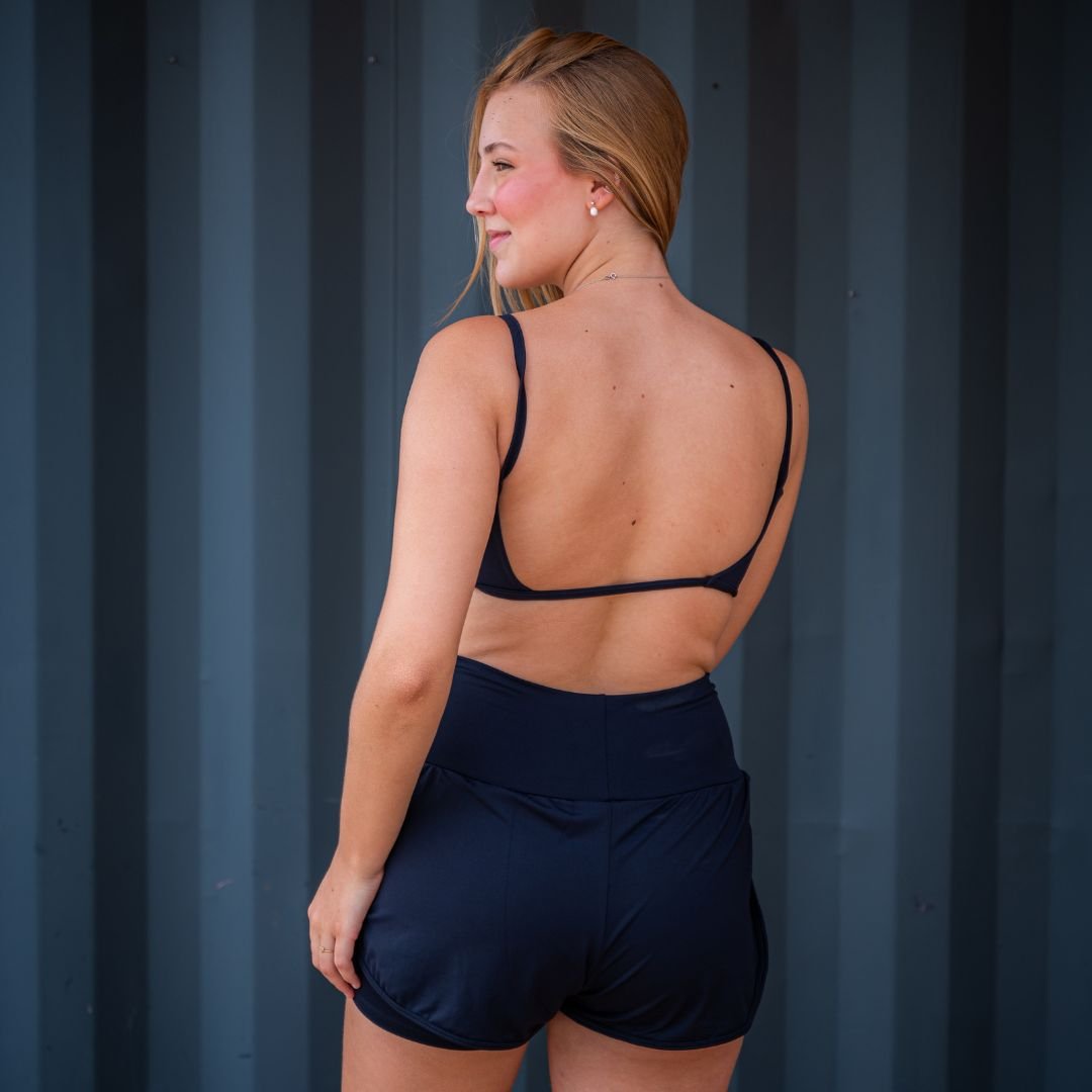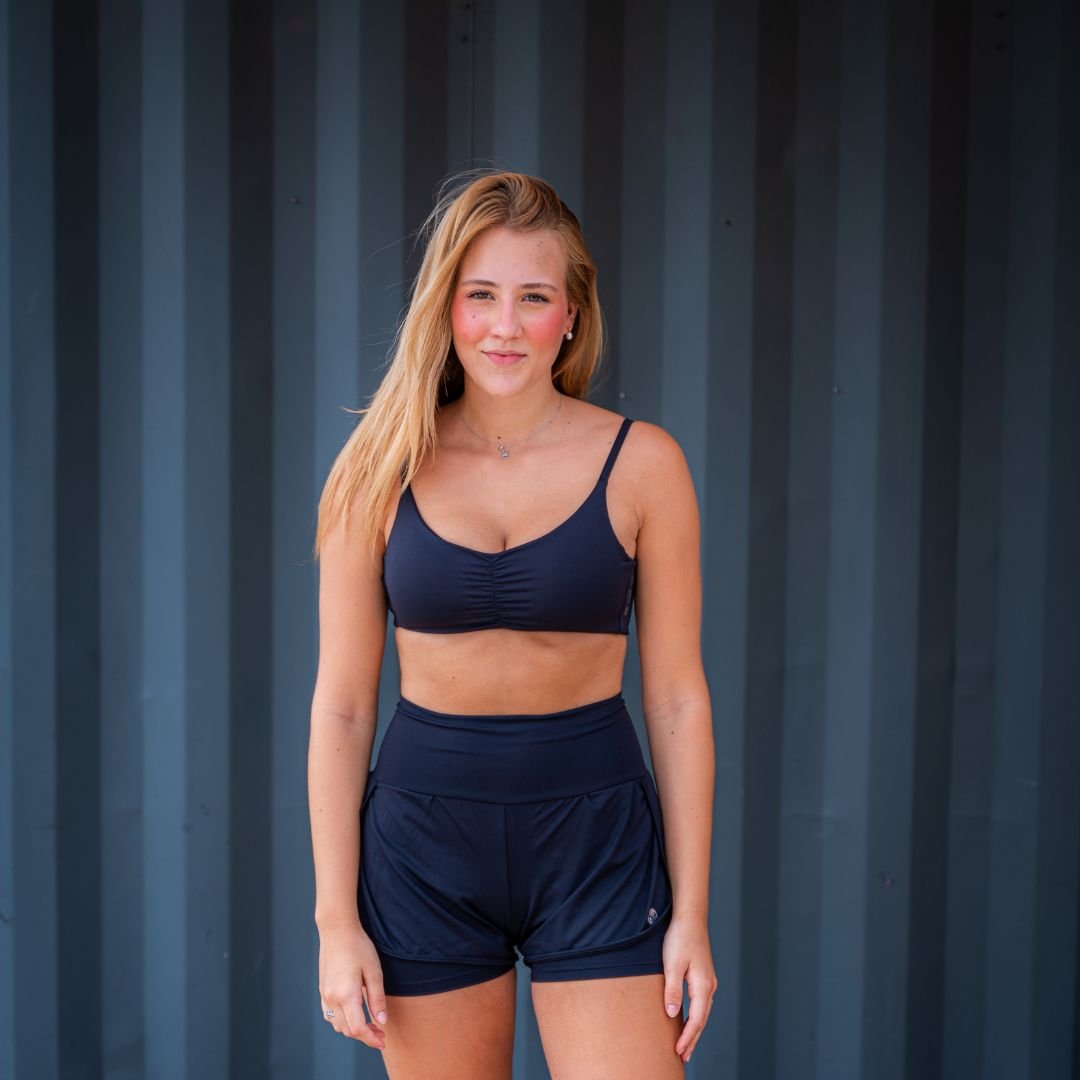 Short duplo, campeão de vendas, com cós alto e cintura alta feito com tecido poliamida com elastano com proteção solar UV50.