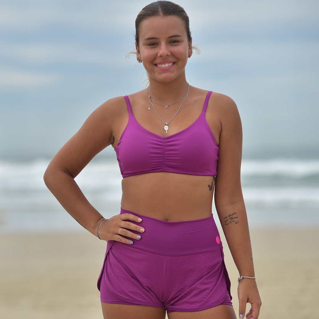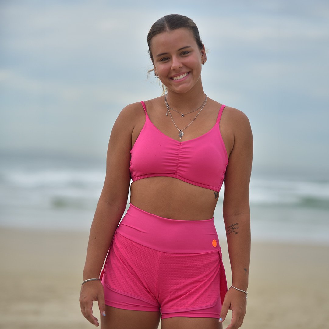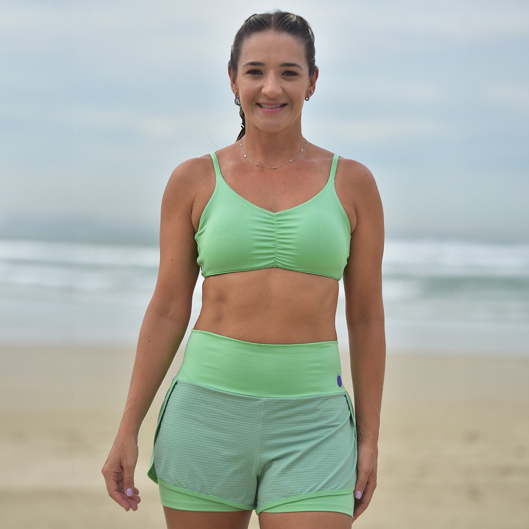 Short duplo com cintura alta, a bermuda interna fica justa ao corpo com tecido em poliamida com elastano com proteção solar UV50 e super confortável.
