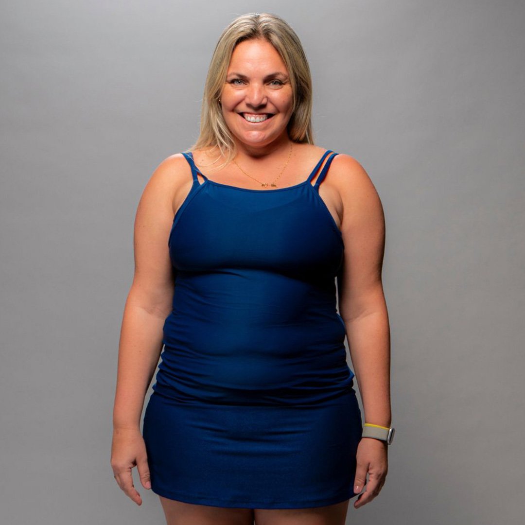 Tecido em poliamida com elastano e proteção solar UV50+, sua textura tem um canelado com leve toque cintilante nos fios.