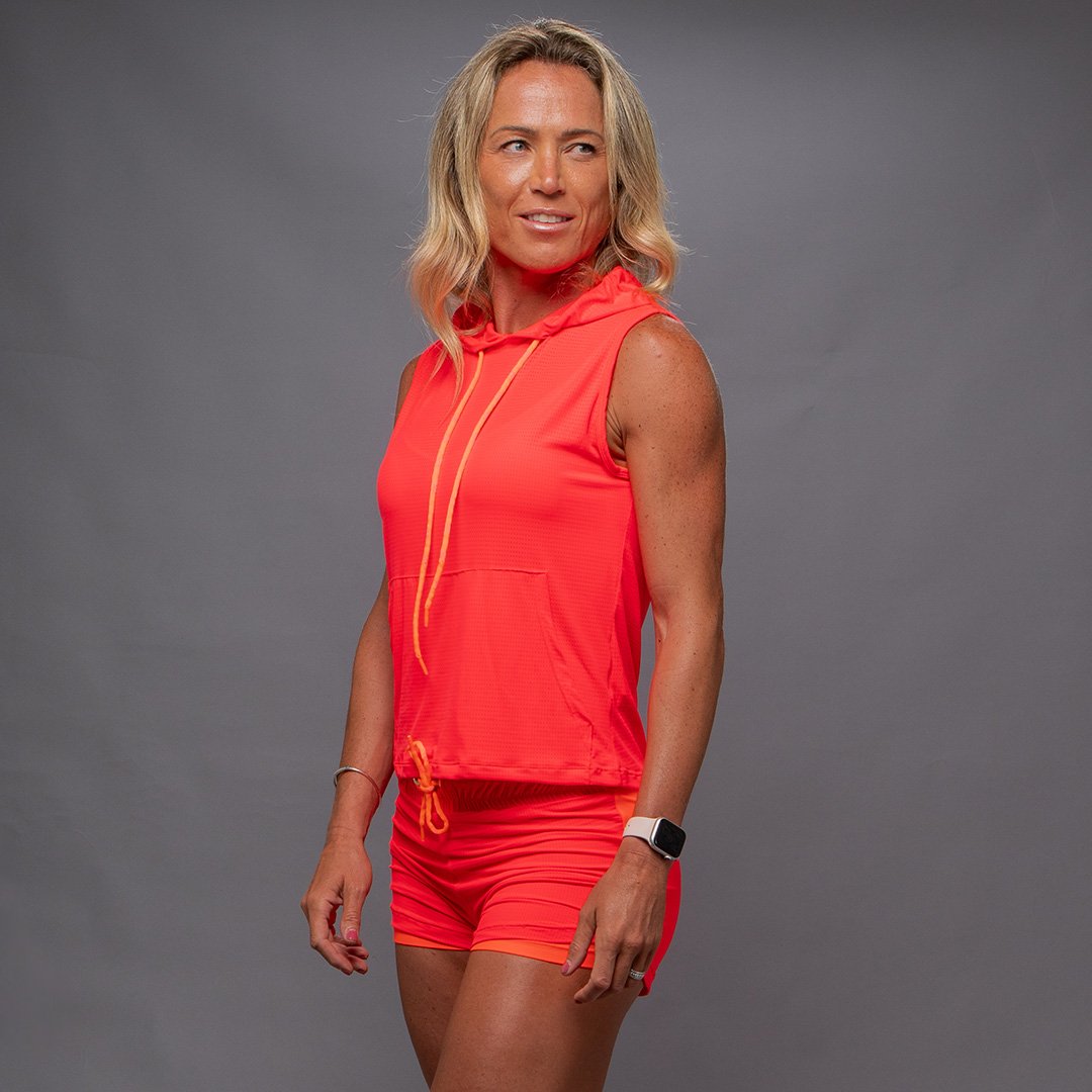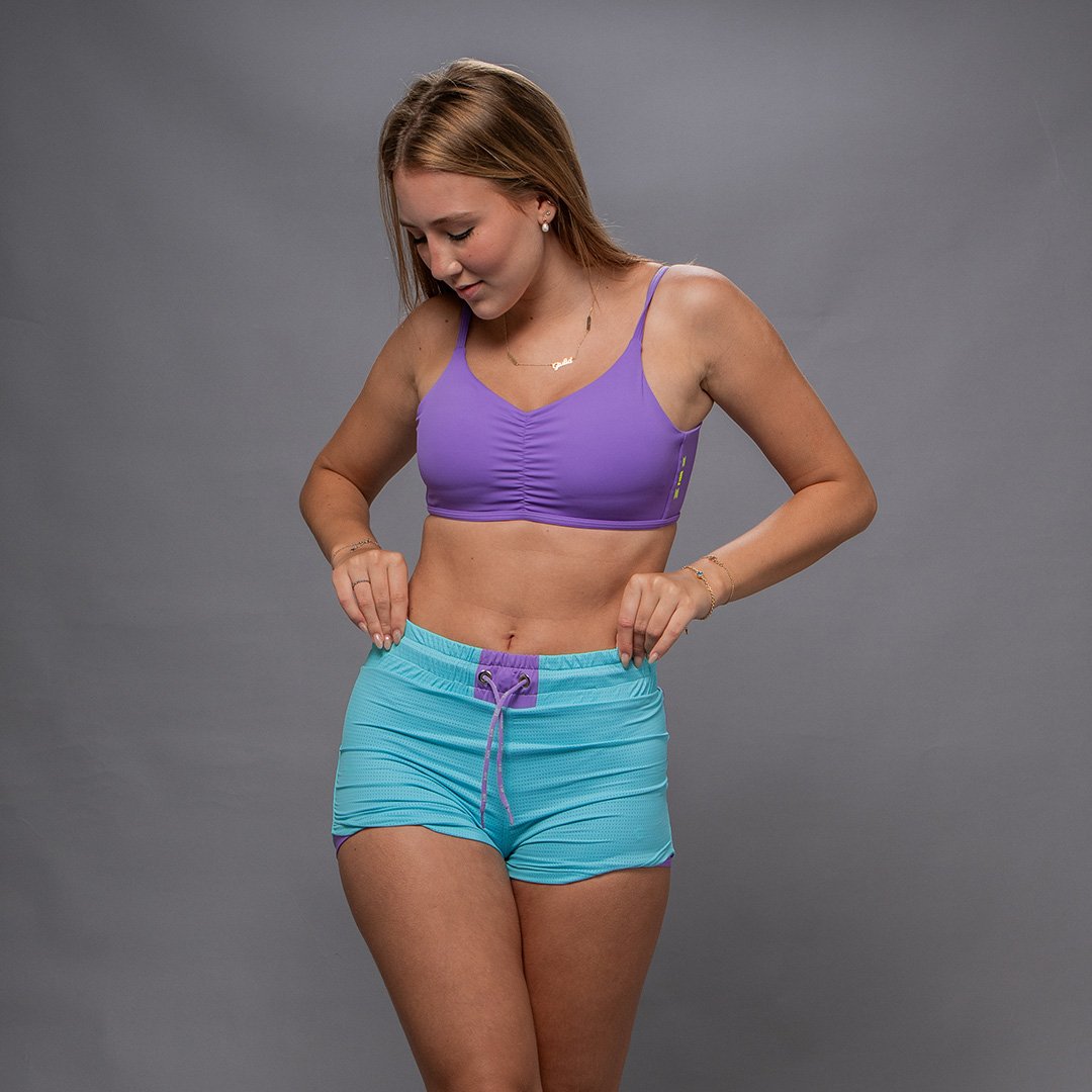 Short duplo com cintura alta em dry fit, em tecido poliamida com elastano, com fator de proteção UV50+.