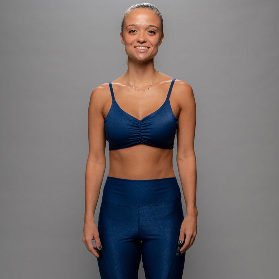 Top em tecido poliamida com elastano com proteção solar UV50+, confeccionada com fios brilhantes que adicionam um toque cintilante e canelado. Possui bojo removível.
